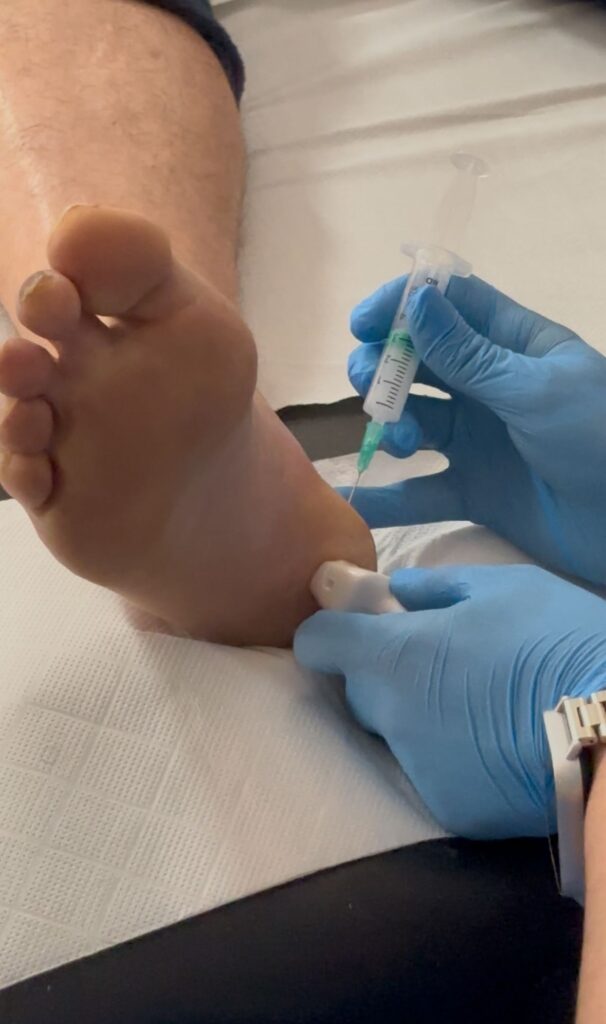 Esta técnica mínimamente invasiva representa la vanguardia en el tratamiento de lesiones del pie y tobillo. Mediante el uso de ecografía de alta resolución, visualizamos con exactitud la estructura afectada para dirigir el tratamiento de forma controlada, garantizando una eficacia muy superior a las técnicas convencionales.